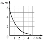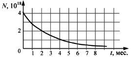 ?) 2 мес. ?) 3 мес. ?) 4 мес. ?) 1 мес. Вопрос id:438010 Тема/шкала: B20-Радиоактивность. Ядерные реакции-Ядерное излучение, радиоактивный распад Дан график изменения числа ядер находящегося в пробирке радиоактивного изотопа с течением времени.