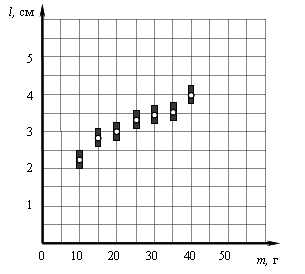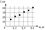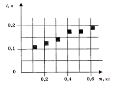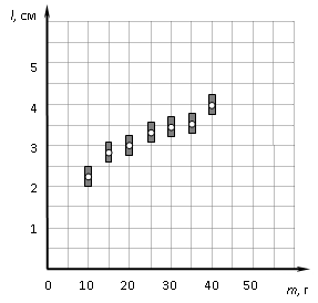 На графике представлены результаты измерения длины пружины l при различных значениях массы m подвешенных к пружине грузов. Погрешность измерения массы