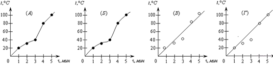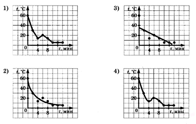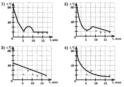?) 1 ?) 3 ?) 2 ?) 4 Вопрос id:438268 Тема/шкала: B23-Механика — квантовая физика (методы научного познания)-Анализ графиков На рисунке точками отмечены результаты измерения температуры остывающей воды. Какой из графиков зависимости температуры от времени — 1, 2, 3, или 4 — проведен по этим точкам правильно?