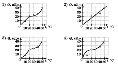 ?) 4 ?) 1 ?) 2 ?) 3 Вопрос id:438269 Тема/шкала: B23-Механика — квантовая физика (методы научного познания)-Анализ графиков На рисунке точками отмечены результаты измерений температуры тела и количества теплоты, подведенного к нему. Какой из графиков — 1, 2, 3 или 4, — построен по этим точкам наиболее точно? Считать, что в процессе нагревания тела не происходит изменения агрегатного состояния вещества.