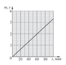 В электролитической ванне происходит покрытие пластинки слоем некоторого вещества. Используя приведённый график зависимости массы m выделяющегося вещества от времени t, определите скорость возрастания массы пластинки.