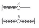 Шарик А массой m надет на гладкую спицу и прикреплён к пружине жёсткостью к, которая прикреплена другим концом к вертикальной опоре. Шарик В массой 2m надет на другую спицу и прикреплён к двум одинаковым пружинам, которые другими концами прикреплены к вертикальным опорам.