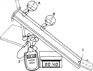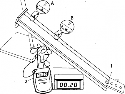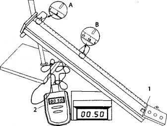 В момент начала движения верхний датчик (А) включает секундомер (2), при прохождении ползунка мимо нижнего датчика (В) секундомер выключается. Числа на линейке обозначают длину в сантиметрах. Секундомер измеряет время в секундах. Ускорение ползунка в любой момент времени вычисляется по формуле