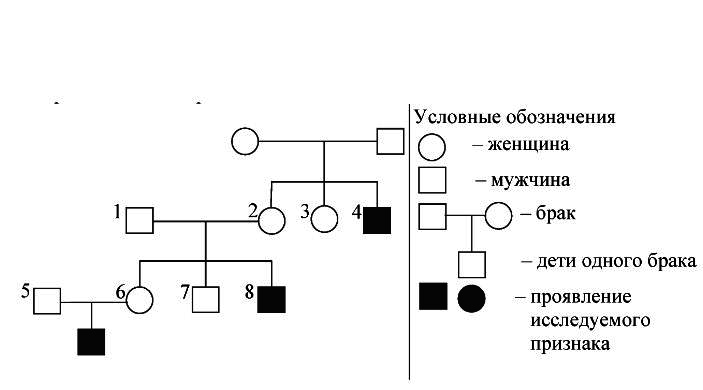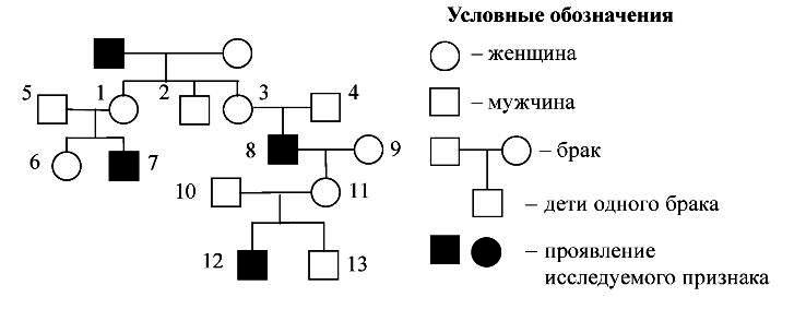 У отца третья группа крови и положительный резус (дигетерозигота), у матери вторая группа и положительный резус (дигомозигота). Определите генотипы родителей. Какую группу крови и резус-фактор могут иметь дети в этой семье, каковы их возможные генотипы и соотношение фенотипов? Составьте схему решения задачи. Какой закон наследственности проявляется в данном случае? Вопрос id:445997 Тема/шкала: 40.Задача по генетике-Моно- и дигибридное скрещивание,40.Задача по генетике При скрещивании растений кукурузы с гладкими окрашенными зёрнами с растением, дающим морщинистые неокрашенные зёрна, в первом поколении все растения давали гладкие окрашенные зёрна. При анализирующем скрещивании гибридов из F1 в потомстве было четыре фенотипические группы: 1200 гладких окрашенных, 1215 морщинистых неокрашенных, 309 гладких неокрашенных, 315 морщинистых окрашенных. Составьте схему решения задачи. Определите генотипы родителей и потомства в двух скрещиваниях. Объясните формирование четырёх фенотипических групп во втором скрещивании. Вопрос id:445998 Тема/шкала: 40.Задача по генетике-Моно- и дигибридное скрещивание,40.Задача по генетике По изображённой на рисунке родословной определите и объясните характер наследования признака (доминантный или рецессивный, сцеплен или нет с полом), выделенного чёрным цветом. Определите генотипы потомков, обозначенных на схеме цифрами 3, 4, 8, 11 и объясните формирование их генотипов.