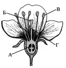 Какой буквой на рисунке обозначена часть цветка, в которой происходит оплодотворение?
