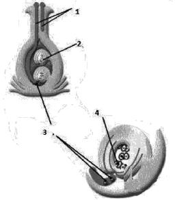 ?) эндосперм семени ?) оболочки семени ?) зародышевый побег в семени ?) мякоть плода Вопрос id:442243 Тема/шкала: 10.Многообразие и систематика растений-Генеративные органы растений,10.Многообразие и систематика растений Ядра клеток восьмиядерного зародышевого мешка покрытосеменных растений образуются путём митоза из ?) диплоидной микроспоры ?) гаплоидной микроспоры ?) гаплоидной макроспоры ?) диплоидной макроспоры Вопрос id:442244 Тема/шкала: 10.Многообразие и систематика растений-Генеративные органы растений,10.Многообразие и систематика растений Какой цифрой обозначен зародышевый мешок? (Нижний рисунок — увеличенный фрагмент второго. )