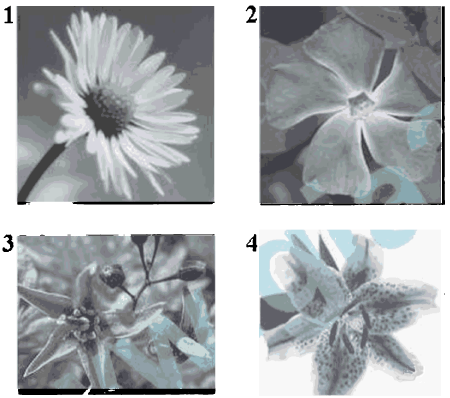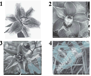 ?) 3 ?) 2 ?) 1 ?) 4 Вопрос id:442266 Тема/шкала: 10.Многообразие и систематика растений-Покрытосеменные: характеристика классов,10.Многообразие и систематика растений Какие из растений, изображённых на рисунке, относятся к классу Однодольные?
