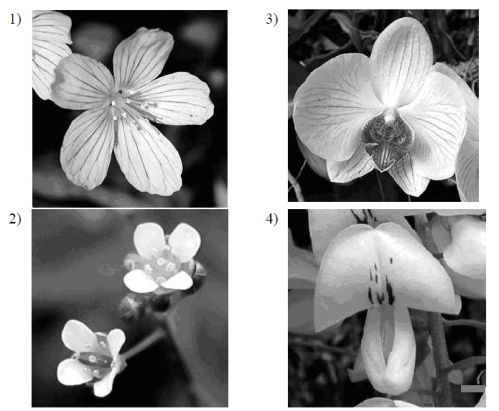 Вопрос id:442467 Тема/шкала: 11.Многообразие и систематика растений-Покрытосеменные: общая характеристика,11.Многообразие и систематика растений На какой из фотографий представлен цветок бобовых растений?
