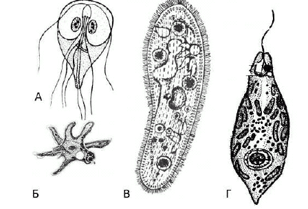 ?) делением надвое ?) спорами ?) почкованием ?) с помощью гамет Вопрос id:442543 Тема/шкала: 12.Основные типы беспозвоночных-Подцарство Одноклеточные животные,12.Основные типы беспозвоночных Пищеварительная вакуоль амёбы образуется в результате ?) деления цитоплазмы ?) фагоцитоза ?) выделения остатков ?) пиноцитоза Вопрос id:442544 Тема/шкала: 12.Основные типы беспозвоночных-Подцарство Одноклеточные животные,12.Основные типы беспозвоночных Обмен ядрами в процессе размножения происходит у ?) эвглен ?) инфузорий ?) амёб ?) плазмодиев Вопрос id:442545 Тема/шкала: 12.Основные типы беспозвоночных-Подцарство Одноклеточные животные,12.Основные типы беспозвоночных Малое и большое ядра есть у ?) амёбы обыкновенной ?) инфузории-туфельки ?) амёбы дизентерийной ?) эвглены зелёной Вопрос id:442546 Тема/шкала: 12.Основные типы беспозвоночных-Подцарство Одноклеточные животные,12.Основные типы беспозвоночных Возбудителем малярии является ?) одноклеточный гриб ?) простейшее животное ?) бактерия ?) членистоногое животное Вопрос id:442547 Тема/шкала: 12.Основные типы беспозвоночных-Подцарство Одноклеточные животные,12.Основные типы беспозвоночных Какую функцию в теле инфузории-туфельки выполняют органоиды, обозначенные на рисунке вопросительным знаком? ?) поступательного вращательного движения ?) ориентации в среде обитания ?) выделения из организма вредных веществ ?) защиты от механических воздействий среды Вопрос id:442548 Тема/шкала: 12.Основные типы беспозвоночных-Подцарство Одноклеточные животные,12.Основные типы беспозвоночных Что происходит в пищеварительных вакуолях простейших? ?) синтезируются органические вещества ?) неорганические вещества растворяются и выводятся наружу ?) сложные органические вещества расщепляются до мономеров ?) органические вещества превращаются в воду и углекислый газ Вопрос id:442549 Тема/шкала: 12.Основные типы беспозвоночных-Подцарство Одноклеточные животные,12.Основные типы беспозвоночных Ответная реакция инфузории-туфельки на действия внешних факторов — это ?) инстинкт ?) регуляция ?) раздражимость ?) рефлекс Вопрос id:442550 Тема/шкала: 12.Основные типы беспозвоночных-Подцарство Одноклеточные животные,12.Основные типы беспозвоночных Кто из изображённых на рисунке животных способен к фотосинтезу?