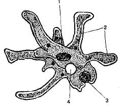 ?) А ?) Б ?) В ?) Г Вопрос id:442551 Тема/шкала: 12.Основные типы беспозвоночных-Подцарство Одноклеточные животные,12.Основные типы беспозвоночных Укажите функцию органоида обозначенного на схеме строения амёбы цифрой 4