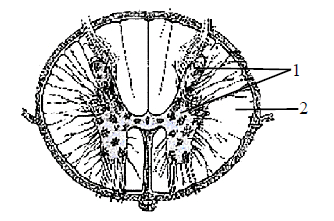 Назовите структуры спинного мозга, обозначенные на рисунке цифрами 1 и 2, и опишите особенности их строения и функции.