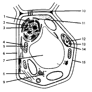 Вопрос id:445454 Тема/шкала: 35.Анализ текстовой и графической информации-Работа с рисунком,35.Анализ текстовой и графической информации Запишите названия частей растительной клетки, указанных на схеме. В ответе укажите номер части и её название, схему клетки перерисовывать не нужно.