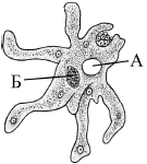 К какому подцарству, типу относят животное, изображённое на рисунке? Что обозначено буквами А и Б и в чём состоит роль этих структур в жизни животного?