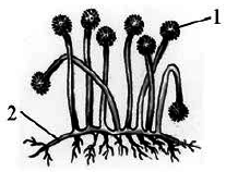 Назовите изображённый на рисунке организм и царство, к которому его относят. Что обозначено цифрами 1, 2? Какова роль этих организмов в экосистеме?
