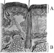 Назовите слои кожи человека, обозначенные на рисунке буквами А и В. Укажите функции, которые они выполняют.