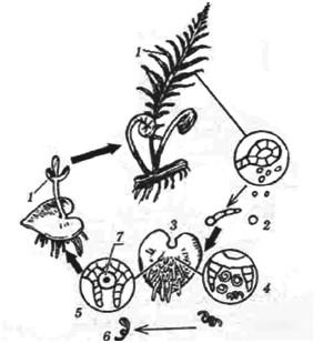 Вопрос id:445435 Тема/шкала: 35.Анализ текстовой и графической информации-Работа с рисунком,35.Анализ текстовой и графической информации Какими цифрами обозначены на рисунке «Цикл развития папоротника» гаплоидные стадии развития? Назовите их.