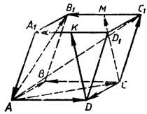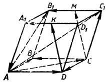 ?) ?) ?) ?) Вопрос id:502644 На рисунке изображен параллелепипед, точки М и К - середины ребер В1С1 и A1D1. Укажите вектор, который получится, если отложить от точки D вектор, равный
