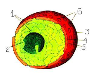 Цифрой 3 на рисунке обозначено: ?) Наружная мембрана ?) Ядрышко ?) Нити ДНК ?) Оболочка ядра ?) Ядерные поры ?) Внутренняя мембрана Вопрос id:545852