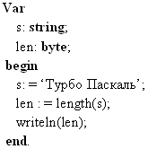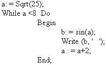 Тело цикла будет выполнено ___ раз (раза). ?) 2 ?) 1 ?) 3 ?) 4 Вопрос id:558390 Немедленный выход из цикла осуществляется с помощью оператора ?) If ?) Continue ?) Break ?) End Вопрос id:558391 В операторе цикла for i:=20 downto 10 do writeln(i); переменная цикла i изменяется с шагом ?) 10 ?) 1 ?) 20 ?) -1 Вопрос id:558392 В операторе цикла с параметром используются служебные слова ?) While .. Do ?) IF … Then ?) For…To ?) Repeat..Until Вопрос id:558413 if x > 0 then begin a: = sqrt(x); b: = sqr(x) end else begin a: = sqr(x); b: = sqrt(abs(x)) end; При x = -4 ?) a = 16, b = 2 ?) a = 16, b = 16 ?) a = 2, b = 16 ?) a = 2, b = 2 Вопрос id:558429 Группа операторов, заключенная между служебными словами BEGIN и END, и воспринимаемая языком Pascal как один оператор, называется ?) условным оператором ?) оператором цикла ?) составным оператором ?) оператором присваивания Вопрос id:558430 Для вывода информации в языке Pascal используется операторы ?) WriteLn ?) Write ?) Read ?) ReadLn Вопрос id:558431 Оператор IF <условие> THEN <оператор> является ?) составным оператором ?) оператором присваивания ?) сокращенной формой условного оператора ?) полной формой условного оператора Вопрос id:558447 Формула ?) 2*a+sqrt(a)/(a*b) ?) 2*a+sqrt(a)/a*b ?) (2*a+sqrt (a))/a*b ?) (2*a+sqrt(a))/(a*b) Вопрос id:558448