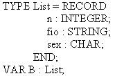 В результате выполнения оператора B.n : = 2.5 возникнет ошибка, так как ?) к компоненте записи нельзя обращаться в операторе присваивания ?) неверно определен записной тип ?) смешаны типы переменных ?) неправильно записано имя компоненты записи Вопрос id:558478 Задано описание: