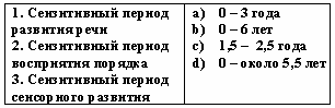 Список вопросов базы знанийТеории и технологии дошкольного образованияВопрос id:616203 Представителем гуманистической психологии является ?) Дж. Брунер ?) Л.Занков ?) К.Роджерс ?) Р.Штейнер Вопрос id:616204 Представителем когнитивной психологии является ?) Л.Занков ?) К.Роджерс ?) Р.Штейнер ?) Дж.Брунер Вопрос id:616205 Представителем концепции развивающего обучения является ?) К.Роджерс ?) Дж.Брунер ?) В.Давыдов ?) М.Монтессори Вопрос id:616206 Представителем педоцентризма является ?) К. Роджерс ?) Дж.Дьюи ?) В.Давыдов ?) Дж.Брунер Вопрос id:616207 Привычки, нормы поведения называются ?) отношениями ?) действиями ?) мотивами ?) правилами Вопрос id:616208 Программа «Пилотной школы» разработана в ?) 1985 г. ?) 1990 г. ?) 1970 г. ?) 1965 г. Вопрос id:616209 Программа «Пилотной школы» разработана в(о) ?) Франции ?) Голландии ?) США ?) Германии Вопрос id:616210 Процесс документирования наблюдаемой активности называется ?) подражанием ?) регистрацией ?) наблюдением ?) креативностью Вопрос id:616211 Процесс исторического развития мира живых организмов как в целом, так и отдельных групп называется ?) эволюцией ?) медитацией ?) онтогенезом ?) филогенезом Вопрос id:616212 Процесс самопостроения личности ребенка самим ребенком, исходя из собственного внутреннего потенциала называется, по М.Монтессори, ?) воспитанием ?) учением ?) образованием ?) судьбой Вопрос id:616213 Процесс слежения за ребенком в то время, когда он работает или играет, при невмешательстве в его деятельность, называется ?) креативностью ?) наблюдением ?) подражанием ?) регистрацией Вопрос id:616214 С помощью игр, приготовления пищи, чтения книг, драматизации, участия в общественных мероприятиях программа «Шаг за шагом» помогает детям выстроить свое собственное понимание ?) логики и математики ?) устного и письменного слова ?) физического мира ?) социальной и культурной действительности Вопрос id:616215 С помощью измерения, сравнения, счета, нахождения тождества, выявления последовательности, сортировки и классификации программа «Шаг за шагом» помогает детям выстроить свое собственное понимание ?) физического мира ?) социальной и культурной действительности ?) логики и математики ?) устного и письменного слова Вопрос id:616216 С помощью таких занятий, как измерение и взвешивание предметов, строительство из кубиков, работа по дереву, игра с песком и водой, блоками и веревками, смешивание красок программа «Шаг за шагом» помогает детям выстроить свое собственное понимание ?) устного и письменного слова ?) социальной и культурной действительности ?) логики и математики ?) физического мира Вопрос id:616217 С помощью чтения, письма, рисования, диктовки, слушания, выражения собственных идей программа «Шаг за шагом» помогает детям выстроить свое собственное понимание ?) устного и письменного слова ?) физического мира ?) логики и математики ?) социальной и культурной действительности Вопрос id:616218 Семейные педагоги Борис и Лена Никитины используют дидактический материал "рамки и вкладыши Монтессори" для развития мелкой моторики рук своих семерых детей и пропагандируют этот способ в книге ?) «Уроки творчества» ?) «Ступеньки творчества» ?) «Воспитание сенсорной культуры ребенка от рождения до шести лет» ?) «Век ребенка» Вопрос id:616219 Система самопознания и саморазвития индивидуальности при партнерстве с учителем, в двуединстве чувственного и сверхчувственного опыта духа, души и тела н