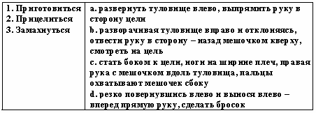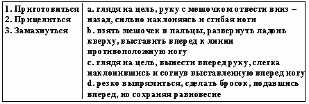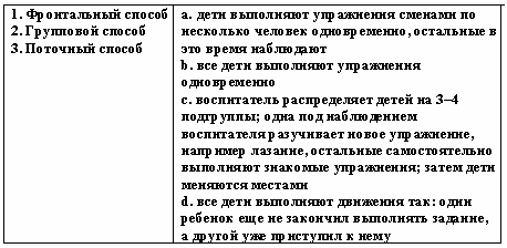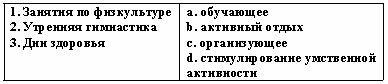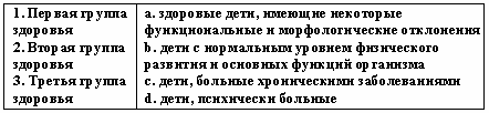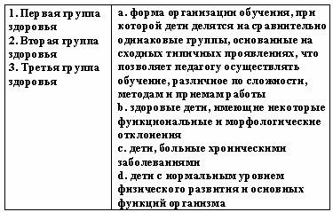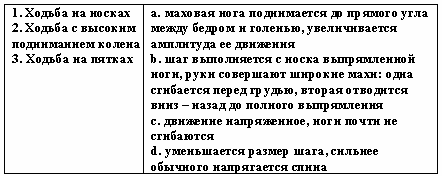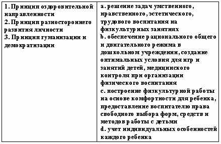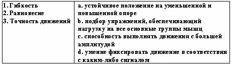 Список вопросов базы знанийТеории и технологии дошкольного образованияВопрос id:615852 Степень владения двигательным действием, которая отличается необходимостью подробного, сознательного контроля за действием, невысокой быстротой, нестабильностью итогов, небольшой прочностью запоминания, называется двигательным ?) упражнением ?) навыком ?) умением ?) задатком Вопрос id:615853 Степень владения техникой действия, при которой управление движениями осуществляется автоматизированно и действия отличаются высокой надежностью, называется двигательным ?) умением ?) упражнением ?) задатком ?) навыком Вопрос id:615854 Строй, в котором дети стоят один возле другого на одной линии, лицом в одну сторону, с интервалом в одну ладонь, приставленную к бедру, называется ?) колонной ?) смыканием ?) шеренгой ?) перестроением Вопрос id:615855 Такие факторы физического воспитания, как необходимость больше времени проводить в естественной среде - на воздухе, чаще соприкасаясь с природой, больше двигаться, используя все разнообразие способов движений в естественной природной среде, называют ?) психогигиеническими ?) психологическими ?) объективными ?) эколого-природными Вопрос id:615856 Такие факторы физического воспитания, как общий режим труда и отдыха, питание, гигиена одежды, обуви, физкультурного оборудования, называют ?) психогигиеническими ?) объективными ?) эколого-природными ?) психологическими Вопрос id:615857 Удобное и целесообразное размещение занимающихся на спортивной площадке, в зале или в другом месте называется ?) потоком ?) ростом ?) строем ?) перестройкой Вопрос id:615858 Умение фиксировать движение в соответствии с каким-либо сигналом называется ?) силой ?) выносливостью ?) точностью ?) ловкостью Вопрос id:615859 Упражнения для развития отдельных мышечных групп называются ?) спортивными ?) общеразвивающими ?) двигательными ?) досуговыми Вопрос id:615860 Уровень развития двигательных умений и навыков, физических качеств человека называется физической ?) сноровкой ?) подготовленностью ?) культурой ?) способностью Вопрос id:615861 Установите соответствие между видами ходьбы и их особенностями ![]() ?) 1 - b, 2 - c, 3 - a ?) 1 - а, 2 - b, 3 - d ?) 1 - c, 2 - a, 3 - d ?) 1 - d, 2 - b, 3 - c Вопрос id:615862 Установите соответствие между группами здоровья и их характеристиками ![]() ?) 1 - d, 2 - b, 3 - c ?) 1 - c, 2 - a, 3 - d ?) 1 - b, 2 - c, 3 - a ?) 1 - а, 2 - b, 3 - d Вопрос id:615863 Установите соответствие между понятиями и их определениями ![]() ?) 1 - а, 2 - b, 3 - d ?) 1 - b, 2 - c, 3 - a ?) 1 - c, 2 - a, 3 - d ?) 1 - d, 2 - b, 3 - c Вопрос id:615864 Установите соответствие между понятиями и их определениями ![]() ?) 1 - c, 2 - d, 3 - b ?) 1 - b, 2 - а, 3 - d ?) 1 - d, 2 - b, 3 - c ?) 1 - a, 2 - c, 3 - a Вопрос id:615865 Установите соответствие между принципами физического воспитания в дошкольном учреждении и их содержанием ![]() ?) 1 - а, 2 - b, 3 - d ?) 1 - с, 2 - b, 3 - a ?) 1 - b, 2 - а, 3 - с ?) 1 - а, 2 - c, 3 - b Вопрос id:615866 Установите соответствие между способами организации детей на физкультурных занятиях и их содержанием ![]() ?) 1 - c, 2 - a, 3 - d ?) 1 - b, 2 - c, 3 - d ?) 1 - a, 2 - b, 3 - c ?) 1 - d, 2 - b, 3 - c Вопрос id:615867 Установите соответствие между фазами метания в вертикальную цель на уровне глаз и ниже прямой рукой сбоку из высокой стойки и их содержанием ![]() ?) 1 - a, 2 - b, 3 - c ?) 1 - с, 2 - a, 3 - b ?) 1 - b, 2 - d, 3 - a ?) 1 - a, 2 - c, 3 - d Вопрос id:615868 Установите соответствие между фазами метания в горизонтальную цель прямой рукой и их содержанием ![]() ?) 1 - b, 2 - c, 3 - a ?) 1 - c, 2 - a, 3 - d ?) 1 - d, 2 - b, 3 - c ?) 1 - a, 2 - b, 3 - c Вопрос id:615869 Установите соответстви