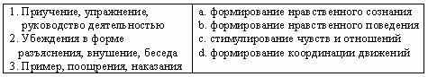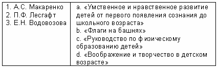 Вопрос id:616800 Установите соответствие между возрастом ребенка и особенностями его восприятия. ![]() ?) 1 - a, 2 - b, 3 - c ?) 1 - b, 2 - c, 3 - a ?) 1 - c, 2 - a, 3 - d ?) 1 - d, 2 - b, 3 - c Вопрос id:616801 Установите соответствие между задачами ДОУ по физическому развитию детей и их содержанием. ![]() ?) 1 - b, 2 - d, 3 - a ?) 1 - a, 2 -b, 3 -c ?) 1 - с, 2 - a, 3 - b ?) 1 - a, 2 - c, 3 - d Вопрос id:616802 Установите соответствие между именами авторов и их работами. ![]() ?) 1 - b, 2 - c, 3 - a ?) 1 - a, 2 - b, 3 - c ?) 1 - c, 2 - a, 3 - d ?) 1 - d, 2 - b, 3 - c Вопрос id:616803 Установите соответствие между именами педагогов и их произведениями. ![]() ?) 1 - с, 2 - b, 3 - a ?) 1 - a, 2 - b, 3 - c ?) 1 - b, 2 - а, 3 - с ?) 1 - а, 2 - c, 3 - b Вопрос id:616804 Установите соответствие между методами нравственного воспитания и их содержанием. ![]() ?) 1 - с, 2 - b, 3 - a ?) 1 - а, 2 - c, 3 - b ?) 1 - b, 2 - а, 3 - с ?) 1 - a, 2 - b, 3 - c Вопрос id:616805 Установите соответствие между педагогами-авторами и их педагогическими трудами. ![]() ?) 1 - d, 2 - b, 3 - c ?) 1 - b, 2 - c, 3 - a ?) 1 - c, 2 - a, 3 - d ?) 1 - a, 2 - b, 3 - c Вопрос id:616806 Установите соответствие между понятиями и их определениями ![]() ?) 1 - b, 2 - a, 3 - d ?) 1 - d, 2 - c, 3 - b ?) 1 - c, 2 - d, 3 - a ?) 1 - a, 2 - b, 3 - c Вопрос id:616807 Установите соответствие между понятиями и их определениями. ![]() ?) 1 - d, 2 - b, 3 - c ?) 1 - a, 2 - c, 3 - d ?) 1 - b, 2 - d, 3 - a ?) 1 - с, 2 - a, 3 - b Вопрос id:616808 Установите соответствие между принципами педагогического исследования и их содержанием.