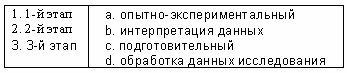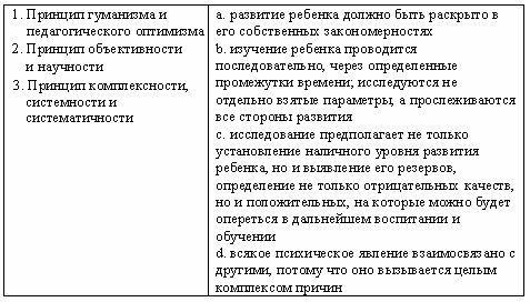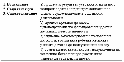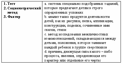 Вопрос id:616809 Установите соответствие между принципами педагогического исследования и их содержанием. ![]() ?) 1 - b, 2 - d, 3 - a ?) 1 - a, 2 - c, 3 - d ?) 1 - a, 2 - b, 3 - c ?) 1 - с, 2 - a, 3 - b Вопрос id:616810 Установите соответствие между этапами педагогического исследования и их названиями. ![]() ?) 1 - c, 2 - a, 3 - d ?) 1 - a, 2 - b, 3 - c ?) 1 - d, 2 - b, 3 - c ?) 1 - b, 2 - c, 3 - a Вопрос id:616811 Установление связи факт - гипотеза осуществляется на ?) этапе интерпретации данных и формулировки выводов ?) подготовительном этапе исследования ?) опытно-экспериментальном этапе исследования ?) этапе обработки данных исследования Вопрос id:616812 Формулировка исследовательской задачи осуществляется на ?) подготовительном этапе исследования ?) этапе обработки данных исследования ?) этапе интерпретации данных и формулировки выводов ?) опытно-экспериментальном этапе исследования Вопрос id:616814 Целенаправленные педагогические воздействия, обеспечивающие формирование чувственного познания и совершенствование ощущений и восприятия, называются воспитанием ?) эстетическим ?) трудовым ?) нравственным ?) сенсорным Вопрос id:616815 Целенаправленный процесс воспитания и обучения в интересах человека, общества и государства называется ?) образованием ?) приучением ?) адаптацией ?) ассимиляцией Вопрос id:616816 Целенаправленный процесс приобщения детей к моральным ценностям человечества и конкретного общества называется воспитанием ?) умственным ?) трудовым ?) нравственным ?) физическим Вопрос id:616817 Целенаправленный процесс формирования творческой личности, способной воспринимать, чувствовать, оценивать прекрасное и создавать художественные ценности, называется воспитанием ?) физическим ?) эстетическим ?) умственным ?) трудовым Вопрос id:616818 «Государства-участники принимают все необходимые меры с целью защиты ребенка от всех форм физического или психологического насилия, оскорбления, грубого обращения или эксплуатации, включая сексуальные злоупотребления со стороны родителей, законных опекунов или любых других лиц, заботящихся о ребенке», - подчеркивается ?) В 19 статье Конвенции ?) В 17 статье Конвенции ?) В 16 статье Конвенции ?) В 24 статье Конвенции Вопрос id:616819 «Ни один ребенок не может быть объектом произвольного или незаконного вмешательства в осуществление его права на личную, семейную жизнь», - записано ?) В 17 статье Конвенции ?) В 16 статье Конвенции ?) В 24 статье Конвенции ?) В 19 статье Конвенции Вопрос id:616820 «Подобно всякой другой деятельности, общение направлено на удовлетворение особой потребности, сущность которой состоит в стремлении к познанию самого себя и других людей». Подобное высказывание принадлежит ?) Д.Б.Эльконину ?) Л.С.Выгодскому ?) А.С.Белкину ?) М.И.Лисиной Вопрос id:616821 «Программа воспитания в детском саду» была разработана ?) В 1962 году ?) В 1948 году ?) В 1989 году ?) В 1950 году Вопрос id:616822 «Программа воспитания в детском саду» была разработана творческим коллективом под руководством ?) А.В.Запорожца ?) Н.П.Саккулиной ?) А.П.Усовой ?) В.Н.Аванесовой Вопрос id:616825 Автором книги «Влияние первых приемов воспитания на физическое развитие детей у разных народностей» является ?) А.С.Макаренко ?) К.Д.Ушинский ?) Е.А.Покровский ?) Л.Н.Толстой Вопрос id:616826 Бытовая деятельность в детском саду становится коллективной ?) В 5-6 лет ?) В 6-7 лет ?) В 4-5 лет ?) В 3-4 года Вопрос id:616827 В 1999 году вышел каталог-справочник «Дошкольное образование в России» под ре