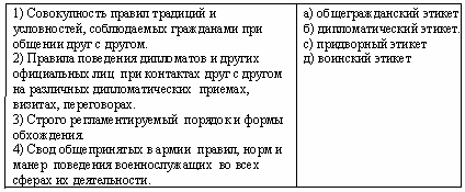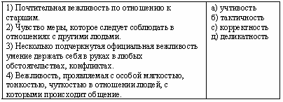 Список вопросов базы знанийАнглийский язык. Практикум по педагогической психологииВопрос id:628639 Оставляют чайную ложку, поданную к чаю, кофе, ?) на бумажной салфетке справа от чашки с блюдцем ?) на скатерти ?) в чашке ?) на блюдце Вопрос id:628640 Отличие дневной обуви от вечерней в том, что ?) для вечерней обуви характерны качество материала и изысканность фасона обуви ?) дневная обувь, как правило, на низком каблуке, вечерняя - на высоком ?) дневная обувь - светлая, вечерняя - темная ?) цена вечерней обуви выше Вопрос id:628641 Пальто и пиджак носят застегнутым ?) в зависимости от погоды ?) всегда, таково правило ?) в зависимости от желания хозяина пальто или пиджака ?) только на улице, в помещении их можно расстегнуть Вопрос id:628642 Первой здоровается девушка ?) которая старше ?) идущая в сопровождении спутника ?) которая моложе ?) идущая в одиночестве Вопрос id:628643 Первым подают угощение ?) тому, кто сидит по левую руку от хозяйки (хозяина) ?) тому, кто проявляет явное нетерпение и признаки голода ?) гостю, сидящему против хода часовой стрелки от хозяина ?) гостю, сидящему по ходу часовой стрелки от хозяйки Вопрос id:628644 Перед подачей на стол разрезается ?) обязательно весь торт- независимо от количества гостей ?) половина торта, и, если он понравится гостям, разрезается оставшаяся половина до конца ?) половина, ведь не все любят сладкое ?) торт на кусочки по количеству гостей Вопрос id:628645 По правилам застольного этикета, шампанское перед подачей на стол ?) охлаждают, и подают закупоренным, открывают за столом ?) охлаждают, открывают, чтобы не мучиться потом с «выстреливающей» пробкой ?) нагревают до комнатной температуры и подают в открытой бутылке ?) нагревают до комнатной температуры и подают закупоренным Вопрос id:628646 По правилам этикета, юноша, гуляя по улице с девушкой, должен ?) отказаться от курения на улице ?) спросить разрешение у девушки, только в том случае если они беседуют ?) спросить разрешение у девушки, чтобы закурить ?) поступать так, как считает нужным Вопрос id:628647 Повседневная одежда девушки отличается от праздничной ?) скромностью фасона и умеренностью цвета ?) характерным атрибутом повседневной одежды - брюками ?) тем, что повседневная одежда, по традиции, темных тонов ?) устаревшим фасоном и темным тоном Вопрос id:628648 Порядок рассадки в автомобиль выглядит следующим образом: ?) девушка пропускает юношу и затем садится сама ?) юноша открывает дверцу и пропускает девушку, а затем садится сам ?) юноша и девушка садятся одновременно с противоположных сторон ?) юноша садится сам и помогает девушке войти в автомобиль Вопрос id:628649 Посматривать на часы во время беседы ?) невежливо в любом случае ?) можно, если нет другого способа показать собеседнику, как вы от него устали ?) можно, если беседа вас утомила или вы торопитесь, можно и прямо сказать о невозможности продолжить беседу ?) можно, если беседа вас утомила, а собеседник ваш ровесник Вопрос id:628650 Поступить с блюдом, доставляющим много хлопот (бульон с яйцом, мелкая дичь, омары, устрицы и т.д.), следует так: ?) попросить это блюдо унести ?) лучше оставить его не съеденным ?) «бороться» с ним до победы ?) повозиться немного, а затем, если дело безнадежно, прекратить есть Вопрос id:628651 Правильно есть за столом бутерброды ?) при помощи одной вилки ?) держа в руке и откусывая от целого куска ?) отламывая по кусочку и отправляя в рот 