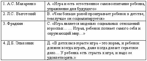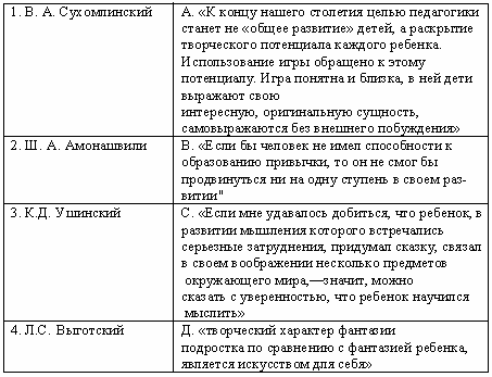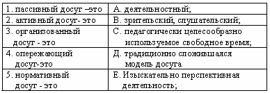 Список вопросов базы знанийОрганизация досуга ребенкаВопрос id:645356 Прогнозирующая функция плана представляет ?) результаты через конкретные действия ?) содержание и объем выполненной работы ?) реализацию поставленных целей ?) взаимодействие субъектов деятельности Вопрос id:645357 Развивающая функция игровых тренингов заключается в ?) актуализации личностных свойств ?) гармоничном развитии личностных качеств для активизации резервных возможностей личности ?) развитии интеллектуальных способностей ?) коррекции эмоционально-волевых процессов Вопрос id:645358 Релаксационная функция игровых тренингов заключается в ?) коррекции психической сферы ?) снятии эмоционального напряжения, вызванного нагрузкой на нервную систему ?) активизации резервных возможностей личности ?) переключении сознания с одной деятельности на другую Вопрос id:645359 Репродуктивная функция плана позволяет ?) спрогнозировать результаты деятельности ?) реализовать поставленные цели ?) увидеть соответствие плана конкретной педагогической действительности ?) восстановить содержание и объем выполненной работы Вопрос id:645361 Самоубеждение - это ?) метод воздействия на волевую сферу ?) метод воздействия на эмоциональную сферу ?) метод воздействия на интеллектуальную сферу ?) метод самовоспитания Вопрос id:645362 Содержание досуга - это ?) форма проведения свободного времени ?) сущность интересов детей ?) совокупность элементов детских увлечений , интересов, хобби ?) деятельность вне учебных занятий Вопрос id:645363 Соревновательные методы - это методы ?) укрепляющие здоровье ?) развивающие у детей физическую активность, ловкость, выносливость и здоровый дух соперничества ?) способствующие укреплению психических функций ?) формирующие умение взаимодействовать с коллективом сверстников Вопрос id:645364 Сочинение сказок - это деятельность ?) близкая по своей сущности к игре; ребенок, как и в игре отождествляет себя со сказочными персонажами ?) форма проведения литературных занятий с детьми ?) литературное творчество детей ?) развивающая речевые и литературные способности детей Вопрос id:645365 Стимулирование - это ?) метод воздействия на мотивационную сферу ?) метод воздействия на эмоциональную сферу ?) метод воздействия на волевую сферу ?) метод самовоспитания Вопрос id:645366 Стимулом к действию в косвенном требовании являются ?) переживания, интересы, стремления воспитанников ?) подчинение педагогическим требованиям и потребность в признании взрослым ?) мотивация педагога и мотивация детей ?) оценка и самооценка собственных действий Вопрос id:645367 Требование как метод воздействия на волевую сферу ребенка предполагает ?) личностно-ориентированное взаимодействие педагога с детьми, в ходе которого вырабатываются общие условия поведения ?) подчинение правилам поведения ?) развитие способности управлять своим поведением, соподчинять мотивы поведения (личные общественным и наоборот) ?) эмоциональную децентрацию Вопрос id:645369 Требование-игра - это ?) требование в игровом оформлении ?) апелляция к сознанию воспитанника ?) естественное отношение уважающих друг друга сторон ?) форма проявления сотрудничества, взаимного доверия и уважения Вопрос id:645370 Требование-намек выступает как ?) сильный стимул для действий детей ?) взаимное доверие между педагогом и детьми ?) убеждение в целесообразности, полезност