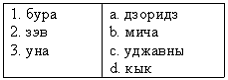 Список вопросов базы знанийКоми языкВопрос id:703340 Cуффиксом глагола 2 лица единственного числа настоящего времени является ?) а ?) ан ?) -анныд ?) ам Вопрос id:703341 В группу названий частей речи не входит ?) Кывбöр ?) Кадакыв ?) Кадакывберд ?) Кыв Вопрос id:703342 В деепричастиях куйлiг «лежа», уджалiг «работая», лыддиг «читая» суффикс -иг(-iг) обозначает ?) прошедшее время ?) именительный падеж ?) добавочное действие, происходящее одновременно с главным действием ?) множественное число Вопрос id:703343 В каком году была принята Конституция Республики Коми? ?) cюрс кöкъямыссё квайтöд воын ?) cюрс öкмыссё öкмысдас нёльöд воын ?) cюрс кöкъямыссё витöд воын ?) cюрс кöкъямыссё öтиöд воын Вопрос id:703344 В коми языке к формам глагола относятся части речи: ?) Прилагательное (Кывберд); ?) Деепричастие (Ногакыв); ?) Местоимение (Нимвежтас) ?) Существительное (Эмакыв); ?) Причастие (Шöркыв); Вопрос id:703345 В коми языке послелоги всегда ставятся ?) в абсолютном начале предложения ?) в абсолютном конце предложения ?) после знаменательных частей речи ?) перед знаменательными частями речи Вопрос id:703346 В коми языке послелоги выполняют функцию ?) подлежащих ?) приставок ?) окончаний ?) предлогов Вопрос id:703347 В название произведения В. Савина «При восходе солнца цветок увял»- «Шондi … дзоридз косьмис» вставьте необходимое деепричастие ?) сьылöмöн ?) уджалiг ?) велöдчигöн ?) петiгöн Вопрос id:703348 В отличие от русского языка, деепричастные обороты в коми языке, как правило ?) не обособляются при письме запятыми ?) выделяются с обеих сторон круглыми скобками ?) выделяются с обеих сторон кавычками ?) обособляются при письме запятыми Вопрос id:703349 В отрицательном спряжении стоит глагол ?) олам ?) радейтан ?) оз гиж ?) гижа Вопрос id:703350 В превосходной степени стоит наречия ?) мичаа ?) бура ?) уна ?) медöдйö Вопрос id:703351 В причастиях уджалысь, узьысь, ворсысь, сьылысь суффикс -ысь указывает на ?) показатель прошедшего времени глагола ?) показатель множественного числа ?) показатель именительного падежа ?) действительные причастия настоящего времени Вопрос id:703352 В ряду перечисленных слов, относящихся к теме: «Стороны света» лишними являются ?) асыввыв ?) войвыв; ?) лун; ?) лунвыв; ?) вой; Вопрос id:703353 В ряду полезных ископаемых Республики Коми лишним является ?) биару ?) мусир ?) из шом ?) нянь Вопрос id:703354 В словах öдйöджык, этшаджык, ылöджык суффикс -джык имеет значение ?) сравнительной степени ?) настоящего времени глаголов ?) множественного числа существительных ?) прошедшего времени глаголов Вопрос id:703355 В состав Государственного Совета РК избирается … депутатов. ?) комын ?) кызь ?) ветымын ?) дас Вопрос id:703356 В состав Советов муниципальных образований РК избирается по … депутатов. ?) дас вит ?) кызь ?) дас ?) кызь вит Вопрос id:703357 В сравнительной степени стоит наречие ?) öдйöджык ?) бура ?) уна ?) мичаа Вопрос id:703358 Вставьте в предложение подходящий по смыслу глагол настоящего времени: Ме … коми кыв. ?) сёя ?) велöда ?) уджала ?) шойчча Вопрос id:703359 Высшим законодательным документом РК является ?) Индöд ?) Тшöктöм ?) Оланподув ?) Оланпас Вопрос id:703360 Географическое название, собственное имя любого географического объекта ?) гидроним ?) антропоним ?) топоним ?) диалект Вопрос id:703361 Главная синтаксическая функция деепричастий в коми языке ?) определение ?) подлежащее ?) обстоятельство ?) сказуемое Вопрос id:703362 Глагол (Кадакыв) в коми языке преимущественно