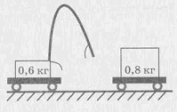 ?) 8 м ?) 6 м ?) 5 м ?) 4 м Вопрос id:709040 После пережигания нити (см. рис.) первая тележка, масса которой равна 0,6кг, стала двигаться со скоростью 0,4м/с. Вторая тележка, масса которой равна 0,8кг, начала двигаться со скоростью по модулю, равной
