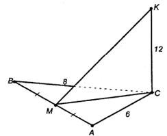 C = 90°, АС = 6 см, ВС = 8 см, СМ – медиана. Через вершину С проведена прямая СК, перпендикулярная к плоскости треугольника ABC, причем СК= 12 см. КМ= см