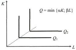 ?) взаимозаменяемыми факторами ?) фиксированными пропорциями факторов ?) неограниченным количеством комбинаций производственных факторов ?) взаимодополняемыми факторами Вопрос id:1060535 Изокванты, выраженные ломаными линиями на рисунке, характерны для технологии с