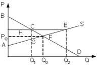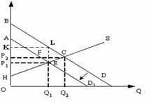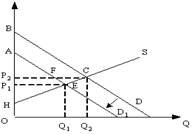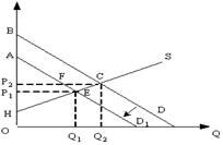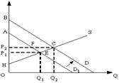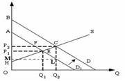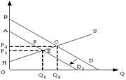 Если правительство введет новый налог(Т), который должен платить потребитель, то излишек производителя (разница между ценой, по которой производитель готов продать товар той ценой, по которой он действительно продал) будет равен площади фигуры ?) HP2C ?) P1AF ?) Q1ECQ2 ?) HP1E Вопрос id:1063557 На рисунке показаны кривые спроса (D) и предложения (S).