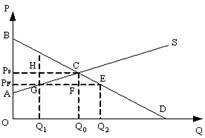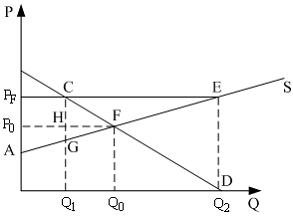 Если правительство установит фиксированную цену (PF) выше равновесной, то излишек потребителя (разница между ценой, которую потребитель готов заплатить и той, которую он действительно заплатил) уменьшится на величину равную площади фигуры ?) AP0F ?) P0PFCF ?) PFBC ?) Q1HFQ0 Вопрос id:1063563 На рисунке показаны кривые спроса (D) и предложения (S).