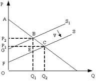 Если правительство введет новый налог, который должен платить потребитель, то излишек производителя (разница между ценой, по которой производитель готов продать товар той ценой, по которой он действительно продал) уменьшится на величину площади фигуры ?) P1P2CE ?) P1AF ?) Q1ECQ2 ?) ABCE Вопрос id:1063554 На рисунке показаны кривые спроса (D) и предложения (S).