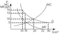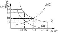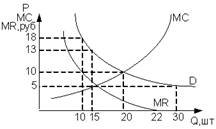 Монопольная цена выше цены совершенно конкурентного рынка на ___ рублей. ?) 10 ?) 5 ?) 3 ?) 13 Вопрос id:1064898 На рисунке показаны кривые спроса (D), предельного дохода (MR) и предельных издержек (MC) фирмы монополиста.