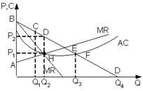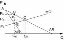 Дополнительная прибыль, получаемая монополистом от продажи товара по монопольным ценам равна площади фигуры ?) BCF ?) EFC ?) QmBCQc ?) РcPmBF Вопрос id:1064908 На рисунке показаны кривые среднего (AR) и предельного (MR) дохода, предельных издержек (MC) фирмы монополиста.