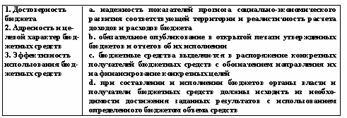 Список вопросов базы знанийБюджетная система и бюджетный процесс (магистр.)Вопрос id:1066052 Бюджетные средства, передаваемые бюджету другого уровня, юридическому или физическому лицам на условиях долевого финансирования целевых расходов, - это ?) субвенция ?) субсидия ?) трансферты ?) дотация Вопрос id:1066053 Бюджетный федерализм - это ?) взаимоотношения органов государственной власти и местного самоуправления по вопросам распределения регулирующих доходов, перераспределения средств между бюджетами ?) механизм распределения доли налоговых доходов и неналоговых отчислений между региональными и федеральным бюджетами ?) форма образования и расходования денежных средств, предназначенных для обеспечения задач и функций, отнесенных к предметам ведения субъекта РФ ?) форма образования и расходования денежных средств, предназначенных для обеспечения задач и функций, отнесенных к предметам ведения местного самоуправления Вопрос id:1066054 В организационную структуру Министерства финансов не входит ?) федеральное казначейство ?) бюджетное управление ?) налоговая полиция ?) контрольно-ревизионное управление Вопрос id:1066055 В число основных задач Министерства финансов не входит ?) совершенствование методов финансово-бюджетного планирования ?) составление проекта федерального бюджета ?) разработка единой государственной финансовой политики ?) кредитование бюджетного дефицита Вопрос id:1066056 Второй уровень бюджетной системы РФ не включает бюджеты ?) краевые ?) окружные ?) городов, кроме Москвы и Санкт-Петербурга ?) республик в составе РФ Вопрос id:1066057 Главная цель бюджетной политики на 2007 год и среднесрочную перспективу- это ?) высокие темпы роста ?) обеспечение обороноспособности и безопасности ?) повышение уровня и качества жизни населения ?) устойчивые темпы роста Вопрос id:1066058 Для реализации конституционных прав граждан на пенсионное обеспечение, социальное страхование, социальное обеспечение в случае безработицы, охрану здоровья и медицинскую помощь в бюджетной системе сформированы(о) ?) Государственные внебюджетные фонды ?) Агентства по социальному страхованию граждан ?) территориальные фонды социальной помощи ?) Министерство труда и социальной защиты Вопрос id:1066059 Добровольные объединения граждан, в установленном законодательством порядке объединяющихся на основе общности интересов для удовлетворения духовных или иных нематериальных потребностей, - это ?) фонды ?) учреждения ?) ассоциации ?) общественные объединения Вопрос id:1066060 Доля расходов на здравоохранение за счет местных бюджетов в настоящее время составляет более ___% ?) 80 ?) 70 ?) 50 ?) 60 Вопрос id:1066061 Законодательные акты, устанавливающие правила проведения и оформления сделок, движения капитала, защиты частной собственности и т.п., осуществляют регулирование экономики ___ методами ?) косвенными ?) прямыми ?) балансовыми ?) экономико-математическими Вопрос id:1066062 Из перечисленного к косвенным методам регулирования экономики относится(ятся) ![]() ?) 1, 5 ?) 3, 4, 5 ?) 1, 2 ?) 2, 4, 5 Вопрос id:1066063 Из перечисленного критериями благополучия государства являются: 1) уровень произ-водительности труда; 2) величина расходов на оборону; 3) средняя продолжительность жизни населения; 4) конкурентоспособность производимой продукции; 5) численность населения ?) 1, 3, 4 ?) 4, 5 ?) 1, 3 ?) 1, 2, 3 Вопрос id:1066064 Использование государстве