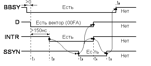 Вопрос id:1250712 В управлении технологическим процессом выделяются следующие фазы: ?) анализ полученной информации и принятие решений ?) получение и первичная обработка информации ?) получение и вторичная обработка информации ?) создание модели системы управления ?) реализация управляющих воздействий Вопрос id:1250713 На рисунке показана временная диаграмма прерывания. Здесь в момент времени ___ процессор принимает вектор и отвечает контроллеру сигналом SSYN