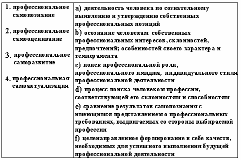 Список вопросов базы знанийОсновы профориентологииВопрос id:1286752 Отсутствие психологического контакта между обследуемым и диагностом на результаты профдиагностики ?) влияют негативно ?) не влияют ?) влияют, но характер влияния неопределенный ?) влияют позитивно Вопрос id:1286753 Первичный выбор профессии характерен для ?) взрослых людей ?) учащихся младшего школьного возраста ?) подростков ?) учащихся юношеского возраста Вопрос id:1286754 Первое бюро по выбору профессии открылось в Бостоне в ?) 1908 г. ?) 1808 г. ?) 1958 г. ?) 1858 г. Вопрос id:1286755 Первое отечественное бюро по профконсультации открылось в ?) Москве ?) Ярославле ?) Харькове ?) Ленинграде Вопрос id:1286756 Первое отечественное бюро по профконсультации открылось в ?) 1927 г. ?) 1967 г. ?) 1947 г. ?) 1987 г. Вопрос id:1286757 Первоначальная ориентировка в различных сферах трудовой деятельности происходит на этапе ?) профессионального обучения ?) первичного выбора профессии ?) профессионального самоопределения ?) профессиональной адаптации Вопрос id:1286758 Первый кабинет профориентации открылся ?) в России ?) во Франции ?) в США ?) в Германии Вопрос id:1286759 Петя П. любит собак, у него их три, хочет стать ветеринаром, готовится поступать в академию сельского хозяйства, если не получится - на курсы кинологов, родители также рекомендуют выбрать ветеринарию; основные признаки профплана ?) частично сформирован, выбор самостоятелен, реализация на деле ?) полностью сформирован, выбор самостоятелен, реализация на деле ?) не сформирован ?) частично сформирован, выбор вынужденный Вопрос id:1286760 По данным современных исследований, в Америке преобладающим типом социального характера является личность ?) конформистская ?) «ориентируемая изнутри» ?) религиозная ?) социально независимая Вопрос id:1286761 Поддаются быстрой тренировке функции ?) сенсорные ?) интеллектуальные ?) специальные ?) психомоторные Вопрос id:1286762 Помощь в конкретном выборе профессии является приоритетной задачей профконсультанта при работе с ?) школьниками 7-8-х классов ?) учащимися колледжей ?) безработными ?) взрослыми специалистами, работающими на реорганизуемых предприятиях Вопрос id:1286763 Предоставление информации о каналах трудоустройства, требованиях к приему на работу и учебу, возможностях освоения различных профессий, перспективах профессионального роста - это цель профконсультирования ?) диагностическая ?) корректирующая ?) формирующая ?) справочно-информационная Вопрос id:1286764 При взаимодействии с партнерами, равными по статусу, профессиональному опыту и возрасту, эффективна стратегия ?) приспособления ?) компромисса ?) сотрудничества ?) избегания Вопрос id:1286765 При врачебной консультации лиц, поступающих на курсы вождения большегрузных автомобилей, особо важное значение имеет заключение ?) лорврача (отоляринголога) ?) окулиста ?) хирурга (ортопеда) ?) невропатолога Вопрос id:1286766 При врачебной консультации лиц, поступающих на курсы электросварщиков, особо важное значение имеет заключение ?) хирурга ?) невропатолога ?) отоларинголога ?) окулиста Вопрос id:1286767 При врачебной консультации лиц, поступающих на отделение настройки музыкальных инструментов особо важное значение имеет заключение ?) ортопеда ?) отоларинголога ?) невропатолога ?) окулиста Вопрос id:1286768 Призыв обучать подрастающее поколение ремеслам не только для того, чтобы стать рабочими, а для того чтобы стать людьми, 