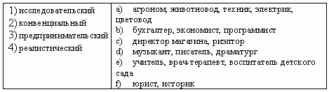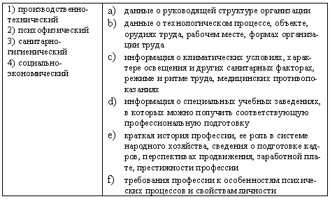 Список вопросов базы знанийОсновы профориентологииВопрос id:1286852 Организация труда выступает как преобладающий мотив профессиональной деятельности у ?) учащихся ПТУ ?) работников со стажем свыше 15 лет ?) работников со стажем 5 лет ?) старшеклассников Вопрос id:1286853 Ориентировочное планирование (в рамках оперативного мышления) связано с развитием ?) памяти ?) воображения ?) эмоций ?) уровня чувствительности Вопрос id:1286854 Ориентировочные признаки трудовых действий выступают в системном анализе объектом изучения уровня ?) структурно-функционального ?) информационного ?) личностно-мотивационного ?) компонентно-целевого Вопрос id:1286855 Период кристаллизации профессионального выбора наступает раньше у подростков ?) национальных меньшинств ?) из высокообеспеченных семей ?) из малообеспеченных семей ?) из неполных семей Вопрос id:1286856 Периодизация профессионального пути, реализующая категории деятельности, разработана ?) А.Н. Леонтьевым ?) С.Л. Рубинштейном ?) Е.А. Климовым ?) Б.М. Тепловым Вопрос id:1286857 По предмету труда профессия программиста относится к ?) техномическим ?) артономическим ?) социономическим ?) сигномическим Вопрос id:1286858 По предмету труда профессия художника относится к ?) биономическим ?) социономическим ?) сигномическим ?) артономическим Вопрос id:1286859 По условиям труда дизайнер жилых помещений относится к группе профессий ?) «О» ?) «Б» ?) «М» ?) «Н» Вопрос id:1286860 По условиям труда космонавт относится к группе профессий ?) «О» ?) «Б» ?) «М» ?) «Н» Вопрос id:1286861 По условиям труда психолог относится к группе профессий ?) «М» ?) «Б» ?) «О» ?) «Н» Вопрос id:1286862 Побуждение к деятельности, связанное с удовлетворением потребности, - это ?) операция ?) цель ?) мотив ?) действие Вопрос id:1286863 Понятие «оперативное мышление» для обозначения мышления, непосредственно включенного в трудовую деятельность человека, введено ?) А.Ц. Пуни ?) В.Н. Пушкиным ?) Б.М. Тепловым ?) В.С. Мерлином Вопрос id:1286864 Понятие карьеры как последовательности профессий, рабочих занятий, мест и позиций в течение жизни человека введено ?) А. Адлером ?) Р. Хейвигхерстом ?) Д. Сьюпером ?) Е.А. Климовым Вопрос id:1286865 Практическое мышление, входящее в профессиональную деятельность, рассматривалось в работах ?) С.Г. Геллерштейна ?) Б.М. Теплова ?) В.Д. Шадрикова ?) А.Ц. Пуни Вопрос id:1286866 Престижность профессии как мотив профессиональной деятельности является более «сильным», значимым для ?) учащихся ПТУ ?) работников со стажем свыше 15 лет ?) старшеклассников ?) работников со стажем 1 - 5 лет Вопрос id:1286867 При изучении профессий в качестве вспомогательного метода выступает метод ?) эксперимента ?) анкетирования ?) тестирования ?) наблюдения Вопрос id:1286868 При оценке профессиональной пригодности в рамках профессионального отбора поиск лиц с высоким уровнем развития психологических качеств представляет собой подход ?) по минимуму ?) индивидуальный ?) ведомственный ?) по максимуму Вопрос id:1286869 Принципы профессиологии сформулированы ?) Е.А. Климовым ?) К.К. Платоновым ?) А.Ц. Пуни ?) В.Н. Пушкиным Вопрос id:1286870 Профессиональные задачи «оценить, различить, распознать» характерны для профессий ?) изыскательных ?) преобразующих ?) исследовательских ?) гностических Вопрос id:1286871 Профессиональный цикл начинается ?) в школе ?) с началом трудовой деятельности ?) в раннем детстве ?) в дошкольном детстве Вопрос id:1286872 Профотбор, производимый на 