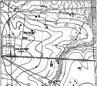 Масштаб: 1 : 10 000 в 1 см 100 метров. Горизонтали проведены через 2,5 метра ?) 1400 ?) 175 ?) 700 ?) 350 Вопрос id:1293268 Используя карту, определим кратчайшее расстояние на местности от загона в совхозе Беличи до вершины горы Голая. Полученный результат округлим до десятков метров. В итоге получим, что это расстояние равно ___ м