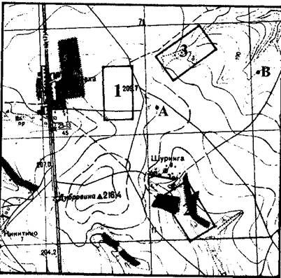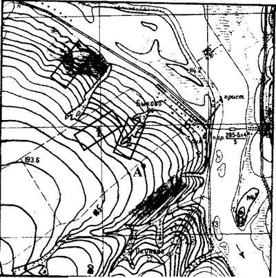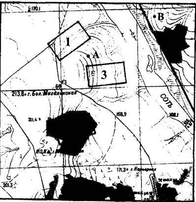 Масштаб: 1 : 10 000 в 1 см 100 метров. Горизонтали проведены через 2,5 метра ?) 700 ?) 250 ?) 500 ?) 125 Вопрос id:1293269 Используя карту, определим кратчайшее расстояние на местности от точки 1 у совхоза Сидорово до отметки уреза воды 129,4 на реке Андога. Полученный результат округлим до десятков метров. Получим ответ: ___ м