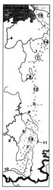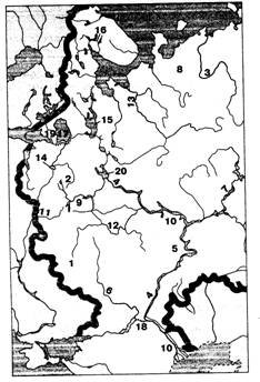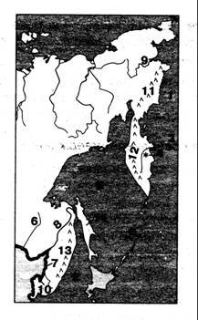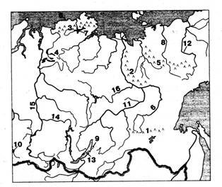 Вопрос id:1294055 Установите соответствие между цифрами на карте и физико-географическим объектом ![]()