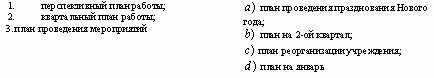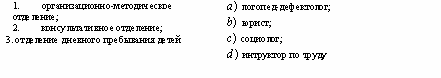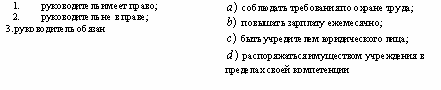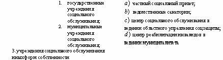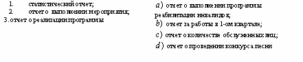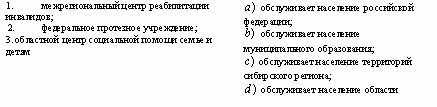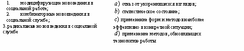 Список вопросов базы знанийОпыт организационно-административной работы в системе социальных служб, учреждений и организацийВопрос id:1403563 Установите соответствие между подразделением комплексного центра социального обслуживания и штатными единицами: ![]() ?) ![]() ?) ![]() ?) ![]() Вопрос id:1403564 Установите соответствие между предметами и методами оценки эффективности деятельности социальных служб: ![]() ?) ![]() ?) ![]() ?) ![]() Вопрос id:1403565 Установите соответствие между функциями руководителя и их содержанием: ![]() ?) ![]() ?) ![]() ?) ![]() Вопрос id:1403566 Установите соответствие: ![]() ?) ![]() ?) ![]() ?) ![]() Вопрос id:1403567 Установите соответствие: ![]() ?) ![]() ?) ![]() ?) ![]() Вопрос id:1403568 Установите соответствие: ![]() ?) ![]() ?) ![]() ?) ![]() Вопрос id:1403569 Установите соответствие: ![]() ?) ![]() ?) ![]() ?) ![]() Вопрос id:1403570 Установите соответствие: ![]() ?) ![]() ?) ![]() ?) ![]() Вопрос id:1403571 Установите соответствие: ![]() ?) ![]() ?) ![]() ?) ![]() Вопрос id:1403572 Установите соответствие: ![]() ?) ![]() ?) ![]() ?) ![]() Вопрос id:1403573 Установите соответствие: ![]() ?) ![]() ?) ![]() ?) ![]() Вопрос id:1403574 Установите соответствие: ![]() ?) ![]() ?) ![]() ?) ![]() Вопрос id:1403575 Установите соответствие: ![]() ?) ![]() ?) ![]() ?) ![]() Вопрос id:1403576 Установите соответствие: ![]() ?) ![]() ?) ![]() ?) ![]() Вопрос id:1403577 Установите соответстие: ![]() ?) ![]() ?) ![]() ?) ![]() Вопрос id:1403578 Учреждение несет ответственность за: 1) нарушение обязательств; 2) искажение статистической отчетности; 3) финансовые нарушения партнеров по договору; 4) нарушение правил охраны труда; 5) ошибки, допущенные учредителем ?) 2, 3, 5 ?) 1, 3, 5 ?) 1, 2, 4 ?) 1, 3 Вопрос id:1403579 Учреждение обязано: 1) создавать производственные мастерские; 2) обеспечивать выплату работникам заработной платы; 3) обеспечивать работникам безопасные условия труда; 4) оказывать услуги, не предусмотренные его Уставом; 5) отчитываться перед учредителем за использование денежных средств ?) 1, 3, 4 ?) 2, 3, 5 ?) 1, 4, 5 ?) 2, 4, 5 Вопрос id:1403580 Учреждение, которое является юридическим лицом, имеет: 1) обособленное имущество; 2) счета в банке; 3) филиалы; 4) печать; 5) подсобное хозяйство ?) 1, 3, 5 ?) 1, 4, 5 ?) 2, 3, 4 ?) 1, 2, 4 Вопрос id:1403581 Экономическими показателями оценки затрат на социальное обслуживание могут быть: 1) доход от платных услуг; 2) уменьшение числа обслуживаемых; 3) затраты на обслуживание одного клиента в месяц; 4) увеличение стоимости платных услуг; 5) привлечение внебюджетных средств ?) 1, 2, 3 ?) 1, 3, 5 ?) 1, 4, 5 ?) 2, 4, 5 Вопрос id:1403582 Эффективность социальной работы можно рассматривать в виде: 1) соотношения достигнутых результатов и задач; 2) количества благодарностей за работу на 1 тысячу населения; 3) мнения , суждения о работе; 4) количества жалоб на тысячу населения; 5) аналитических и статистических отчетов ?) 1, 2, 4 ?) 1, 4, 5 ?) 1, 3, 5 ?) 2, 4, 5 Вопрос id:1403583 В области социальной работы ведутся следующие виды научных исследований: 1) теория и методика социальной работы в различных сферах жизнедеятельности человека; 2) методика преподавания математики; 3) изучение проблем социальной работы в рамках различных ведомств; 4) особенности диспансеризации населения в сельской местности; 5) организация и управление системой социального обслуживания ?) 1, 4, 5 ?) 2, 4, 5 ?) 2, 3, 4 ?) 1, 3, 5 Вопрос id:1403584 В области финансово-хозяйственной деятельности региональные органы соцзащиты имеют право: 1) готовить предложения в проект бюджета; 2) принимать решения по выделению средств из бюджета; 3) представлять сводную статистическую отчетность; 4) проверять финансово-хозяй