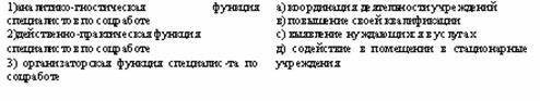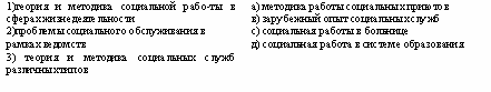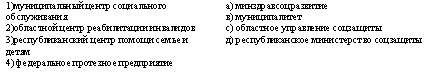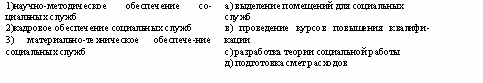 Список вопросов базы знанийОпыт организационно-административной работы в системе социальных служб, учреждений и организацийВопрос id:1403613 Опытно-экспериментальные учреждения социального обслуживания создаются с целью ?) разработки наиболее эффективных форм и методов социальной работы ?) создания привилегированных условий для работы ?) привлечения спонсорских средств ?) увеличения зарплаты сотрудников Вопрос id:1403614 Основными направлениями деятельности органов власти субъектов федерации в сфере социального обслуживания являются: 1) создание оптимальной территориальной социальной службы; 2) финансовое обеспечение социальных служб; 3) оказание социальных услуг населению; 4) содействие в развитии негосударственных служб; 5) подбор кадров для социальных служб ?) 1, 3, 4 ?) 1, 3, 5 ?) 2, 4, 5 ?) 1, 2, 4 Вопрос id:1403615 Подготовка специалистов по социальной работе ведется на уровне ___ уровнях (не) ?) двух ?) одном ?) не ведется в системе высшего профессионального образования ?) трех Вопрос id:1403616 Полномочиями региональных органов социальной защиты населения являются: 1) организация и координация работы социальных служб; 2) организация работы дошкольных учреждений; 3) оказание туристических услуг; 4) организация повышения квалификации сотрудников социальных служб; 5) методическое обеспечение деятельности социальных служб ?) 1, 3, 5 ?) 1, 4, 5 ?) 2, 4, 5 ?) 2, 3, 4 Вопрос id:1403617 Проведение конкурса на лучшее учреждение имеет целью: 1) повысить активность, результативность в работе учреждений; 2) повысить профессиональную квалификацию специалистов; 3) найти новые формы и методы в работе; 4) повысить зарплату сотрудникам; 5) организовать туристические поездки для руководителей ?) 2, 4, 5 ?) 1, 3, 5 ?) 1, 2, 3, 4 ?) 1, 2, 3 Вопрос id:1403618 Проведение конкурсов инновационных проектов позволяет: 1) вести поиск новых форм и методов; 2) привлекать дополнительные средства финансирования социальных служб; 3) повышать квалификацию сотрудников; 4) извлекать прибыль; 5) уйти от контроля ?) 3, 4, 5 ?) 1, 3, 4 ?) 1, 2, 3 ?) 2, 4, 5 Вопрос id:1403619 Программа «Дети России» предусматривает ?) повышение зарплаты для работников учреждений ?) закупку оборудования для предприятий торговли ?) выделение средств на жилищное строительство ?) оснащение учреждений социального обслуживания семьи и детей Вопрос id:1403620 Региональные программы предусматривают ?) развитие сети региональных социальных служб ?) разработку стандартов ?) финансирование федеральных служб ?) разработку федеральных законов Вопрос id:1403621 Результатом методической работы являются: 1) анализ и прогноз социальных процессов на обслуживаемой территории; 2) изучение и внедрение передового опыта работы; 3) укрепление материальной базы; 4) увеличение заработной платы сотрудникам; 5) повышение квалификации специалистов ?) 2, 3, 5 ?) 2, 4, 5 ?) 1, 3, 4 ?) 1, 2, 5 Вопрос id:1403622 Результатом проверки учреждения вышестоящим органом могут быть; 1) обобщение опыта работы; 2) наложение взыскания на руководителя; 3) создание на базе учреждения коммерческой структуры; 4) выдача сотрудникам сертификата о повышении квалификации; 5) повышение разряда сотрудников ?) 2, 4, 5 ?) 1, 3, 4 ?) 1, 2, 5 ?) 1, 3, 5 Вопрос id:1403623 Роль государственных органов в работе с неправительсвтенными организациями состоит в: 1) финансовой поддержке значений проектов НПО; 2) разработке совместных программ; 3) подборе и утверждение руководителей НПО; 4) контрол