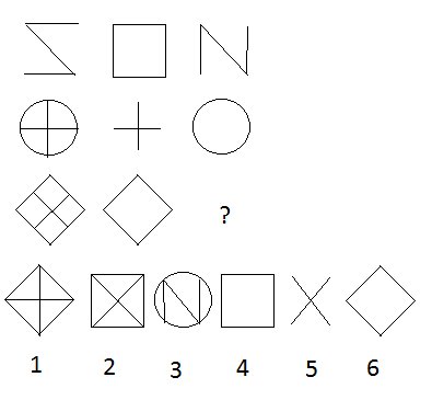 Список вопросов базы знанийIQВопрос id:691 Тема/шкала: Шкала 1,выбрать подходящую картинку Выберите нужную фигуру из четырех пронумерованных ![]() ?) 1 ?) 2 ?) 3 ?) 4 Вопрос id:692 Тема/шкала: Шкала 1,вставить в скобки слово, которое завершает первое слово начинает второе Вставите слово, которое было бы окончанием первого слова и началом второго. АПО ( ) Б Вопрос id:693 Тема/шкала: Шкала 1,продолжить числовой ряд в картинках Вставьте недостающее число. ![]() Вопрос id:694 Тема/шкала: Шкала 1,выбрать подходящую картинку Выберите нужную фигурку из шести пронумерованных ![]() ?) 1 ?) 2 ?) 3 ?) 4 ?) 5 ?) 6 Вопрос id:695 Тема/шкала: Шкала 1,анаграмма Исключите лишнее слово иярино алсть едмь анорбз Вопрос id:696 Тема/шкала: Шкала 1,порядковый номер букв в верхнем ряду Вставьте пропущенное слово. ПАРК (КРАБ) ПОЛБА ТОРТ ( ) МЕТЛА Вопрос id:697 Тема/шкала: Шкала 1,вставить в скобки число Вставьте пропущенное чнсла. 143 (56) 255 218 ( ) 114 Вопрос id:698 Тема/шкала: Шкала 1,продолжить числовой ряд Вставьте пропущенное число. 6 10 18 34 _ Вопрос id:699 Тема/шкала: Шкала 1,анаграмма Решите анаграмму и исключите лишнее слово ЫЙБЛЕ ЙОВУБЛ ИИЙНС ЫЛАЙ Вопрос id:700 Тема/шкала: Шкала 1,продолжить числовой ряд в картинках Вставьте пропущенное число ![]() Вопрос id:701 Тема/шкала: Шкала 1,выбрать подходящую картинку Выберите нужную фигуру из шести пронумерованных ![]() ?) 1 ?) 2 ?) 3 ?) 4 ?) 5 ?) 6 Вопрос id:702 Тема/шкала: Шкала 1,продолжить буквенный ряд Вставьте пропущенную букву С У П С Н П ? Вопрос id:703 Тема/шкала: Шкала 1,вставить в скобки слово, которое завершает первое слово начинает второе Вставьте слово, которое было бы окончанием первого слова и началом второго. КЕС ( ) ЕТ Вопрос id:704 Тема/шкала: Шкала 1,выбрать подходящую картинку Выберите нужную фигуру из шести пронумерованных ![]() ?) 1 ?) 2 ?) 3 ?) 4 ?) 5 ?) 6 Вопрос id:705 Тема/шкала: Шкала 1,вставить в скобки число Вставьте пропущенное число. 148(110)368 243 ( ) 397 Вопрос id:706 Тема/шкала: Шкала 1,продолжить числовой ряд в матрице Вставьте пропущенное число 18 25 4 16 20 3 6 15 ? Вопрос id:707 Тема/шкала: Шкала 1,продолжить буквенный ряд Вставьте недостающие буквы ![]() Вопрос id:708 Тема/шкала: Шкала 1,вставить в скобки слово, которое завершает первое слово начинает второе Вставьте слово, которе служило бы окончанием первого слова и началом второго. AM ( ) АН