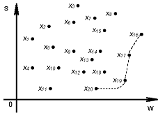 Вопрос id:1454281 Согласно рисунку, иллюстрирующему пространство боевой операции, те варианты, которые при равной эффективности W обладают меньшей стоимостью S, должны лежать на ___ границе области возможных вариантов.